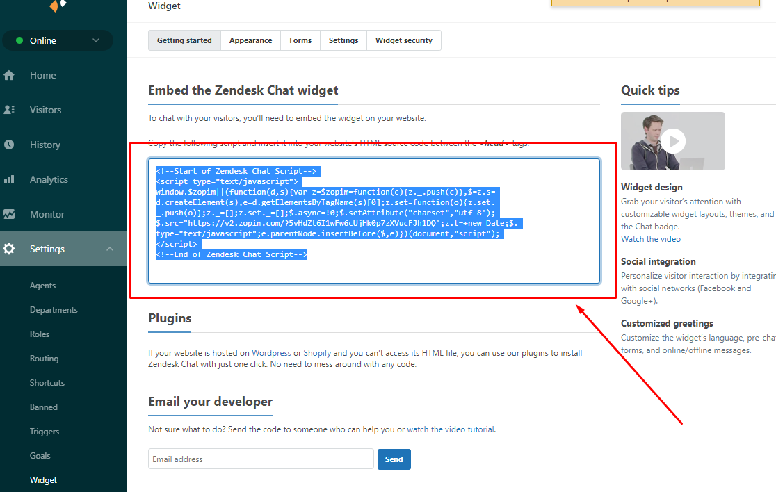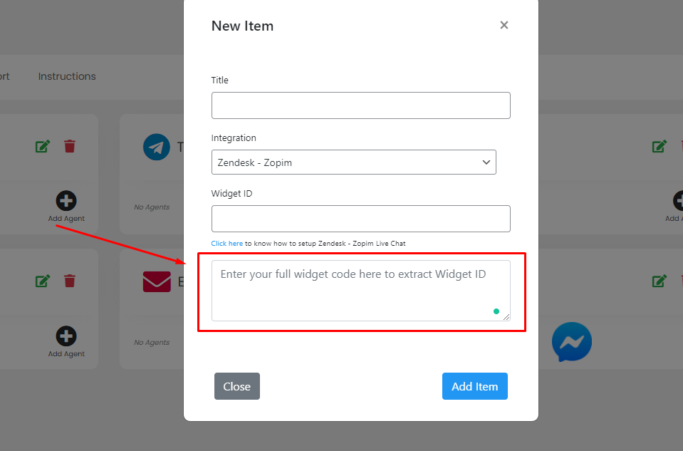 - From the dropdown, select "Zendesk - Zopim" and copy-paste the code in the textarea as shown below.