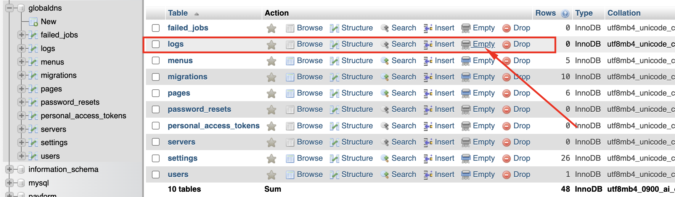 You can delete old logs by logging into your database and manually truncating the database. Login to PHPMyAdmin or a similar database viewer and open the database you use with your Global DNS. You will see the list of tables, hit "Empty" or "Truncate" next to logs